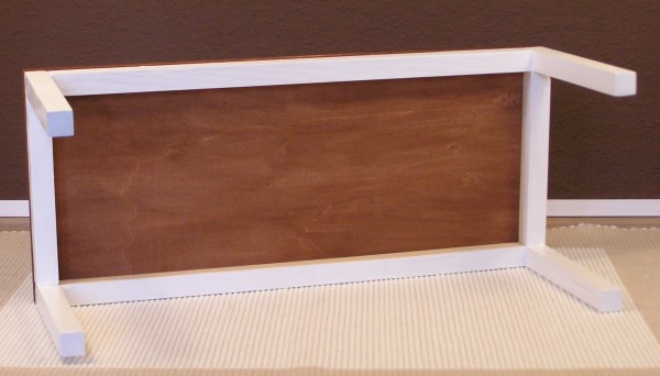 Die Tischplatte habe ich aus Sperrholz zugesägt, mit Acrylfarbe gestrichen und mit Mattlack lasiert. Das Tischgestell ist aus Vierkanthölzern zusammengeleimt und mit weißem Acryllack angestrichen.