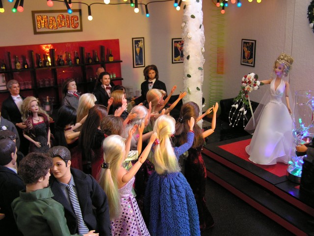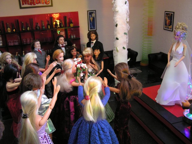 Lisa kündigt den schönen Brauch des Brautstraußwerfens an und alle unver- heirateten weiblichen Hochzeitsgäste versammeln sich auf einer Stelle.